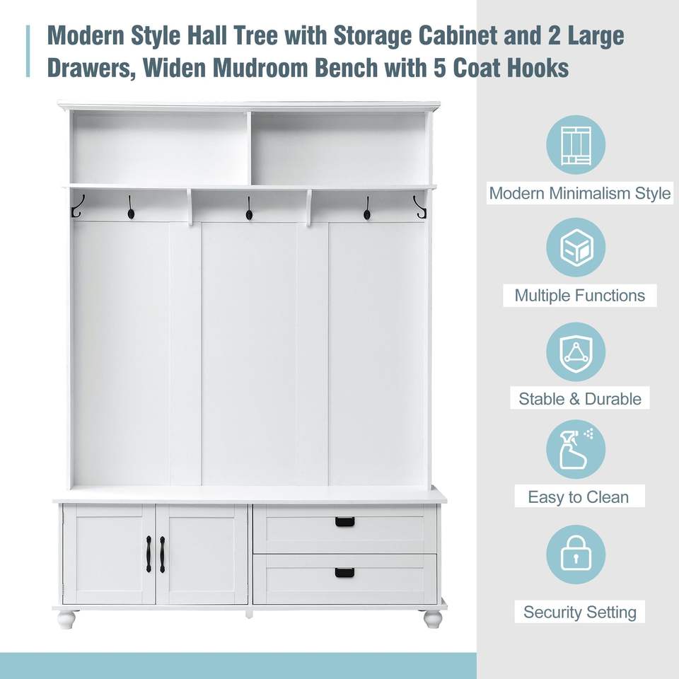 DB Modern Style ON-TREND Hall Tree with 5 Coat Storage Cabinet 2 Large Drawers Widen Mudroom Bench for Bedroom Application