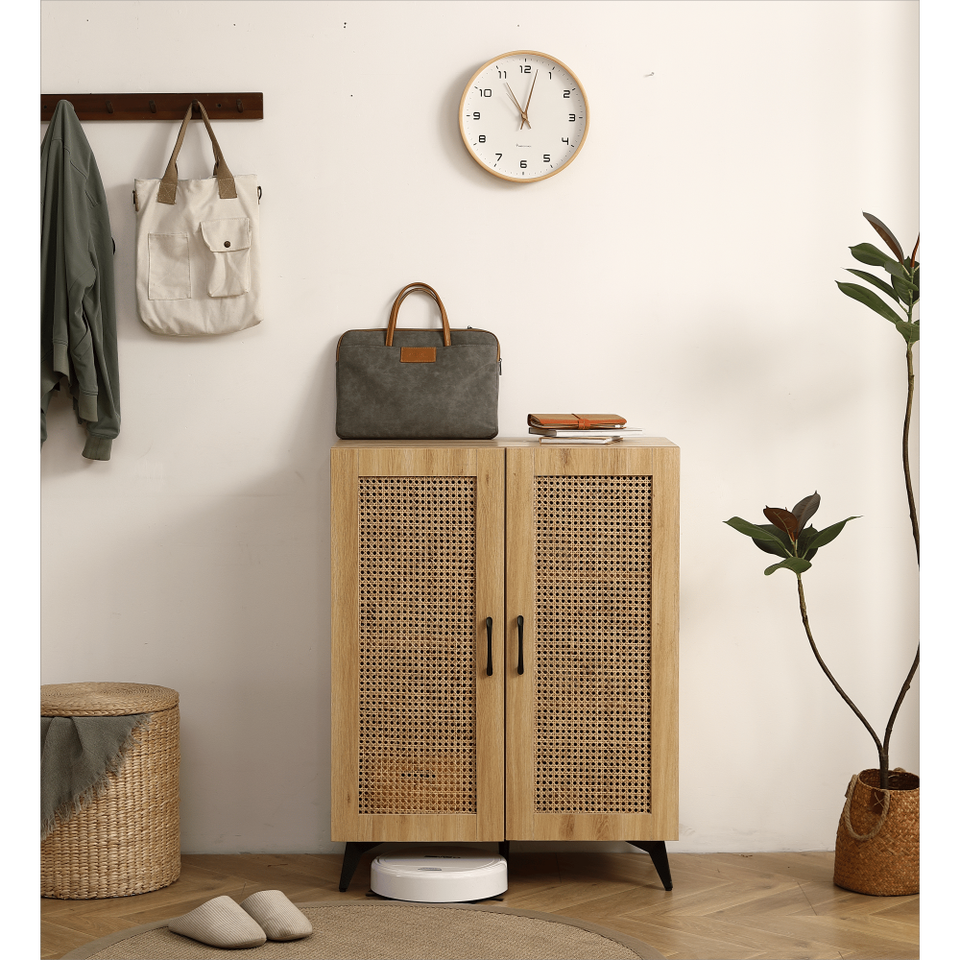 DB Natural Rattan Storage Cabinet 29.5 Inch Double-Door Shoe Rack with Large Storage Space and Modern Design for Home Use
