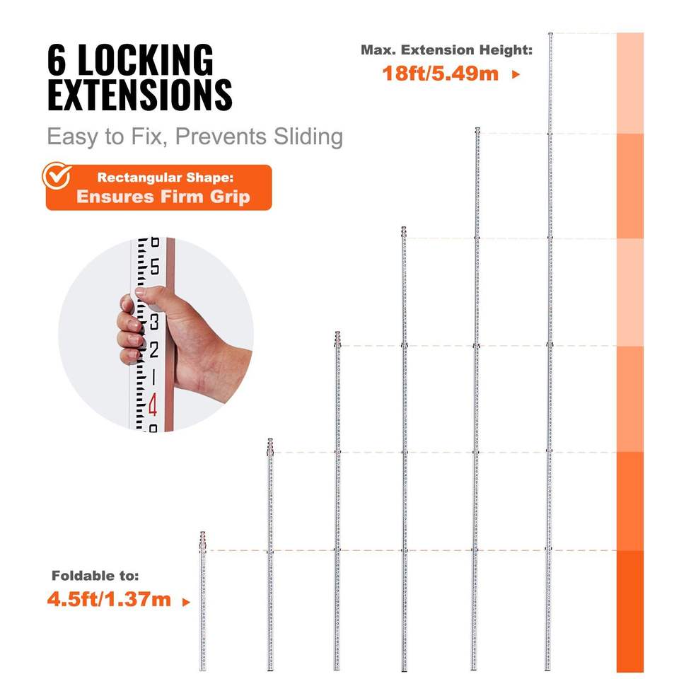 DB Wholesale 18-Foot 1/10th Grade Telescopic Rod 6 Section Level Measuring Instrument with Bag