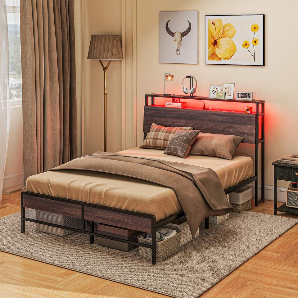 DB for Hot Sale Full Size Metal Bed Frame with LED Lights Headboard Platform Bed Charging Station & 3-Tier Storage Shelf