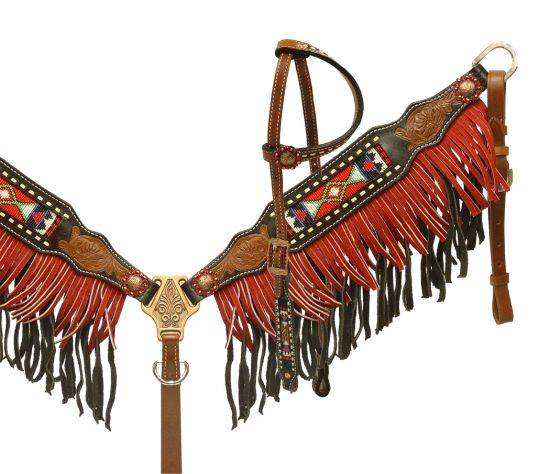 DD Leather Western Bridle Set Durable Suede Fringe Beaded Head Stall Breast Collar with Reins Assorted Colored Fringe for Riding