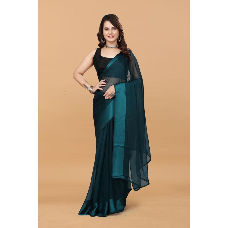 DESIGNER CHIFFON SATIN PLAIN BEAUTIFUL 1 MINUTE SAREE WITH UNSTITCHED BLOUSE BLUE