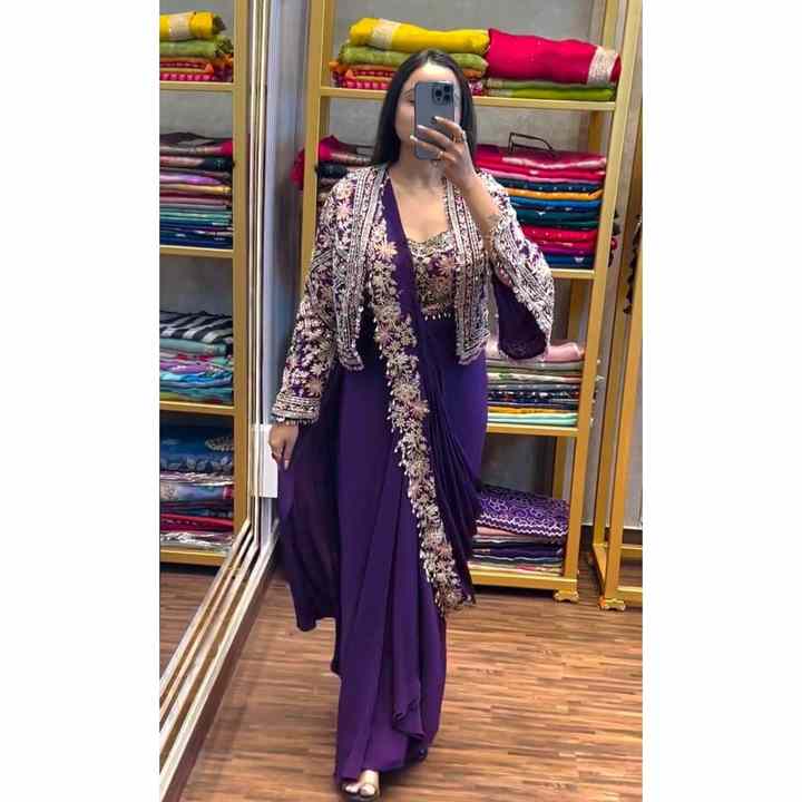 DESIGNER CHINON EMBROIDERY CODING WORK READY to WEAR SAREE STITCHED BLOUSE WITH JACKET PURPLE