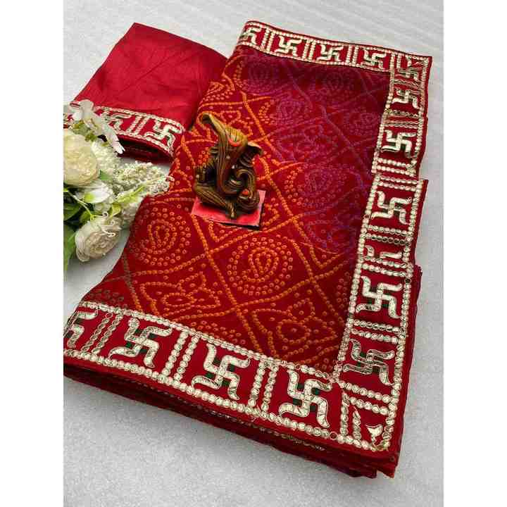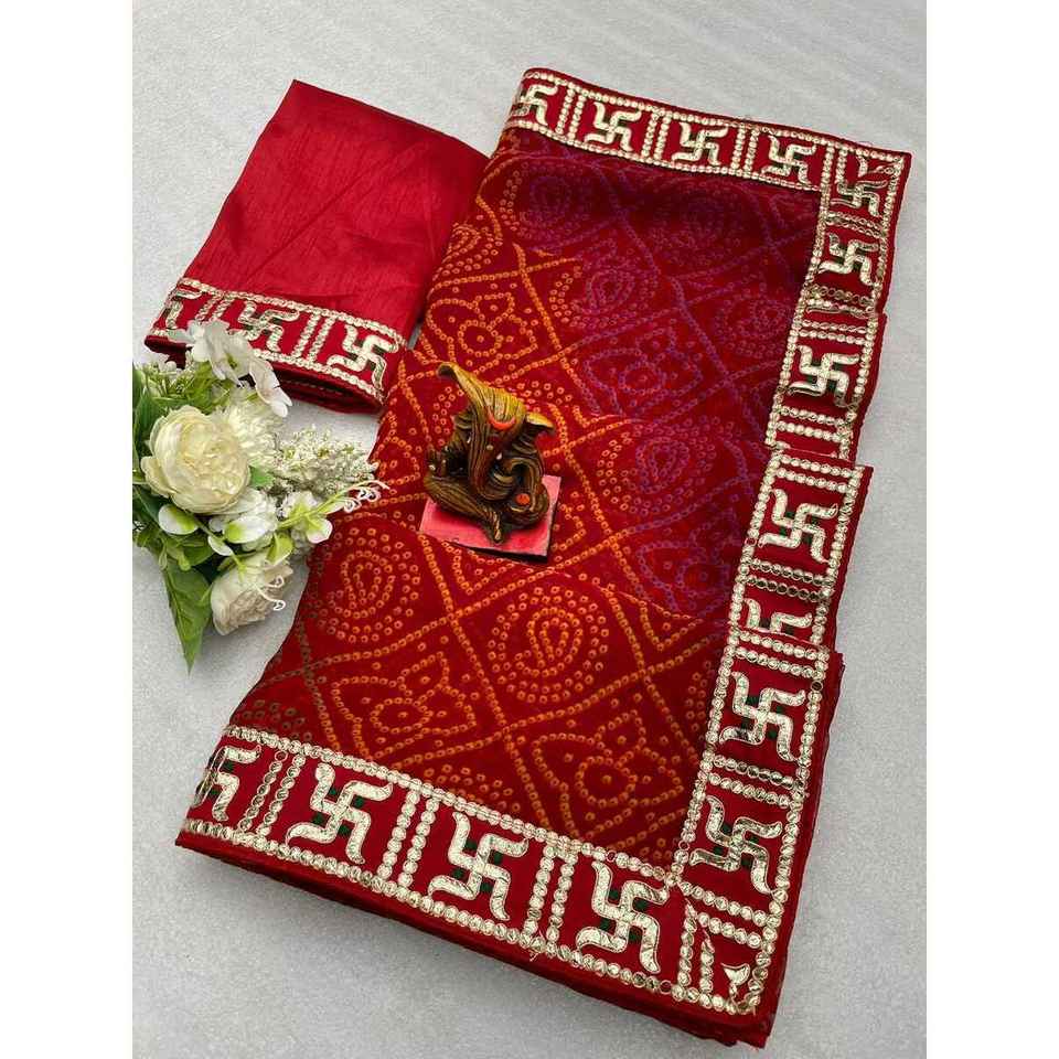 DESIGNER GEORGETTE CODING and GOTA PATI SWASTIK LACE BORDER SAREE WITH UNSTITCHED BLOUSE RED
