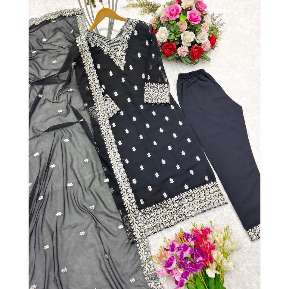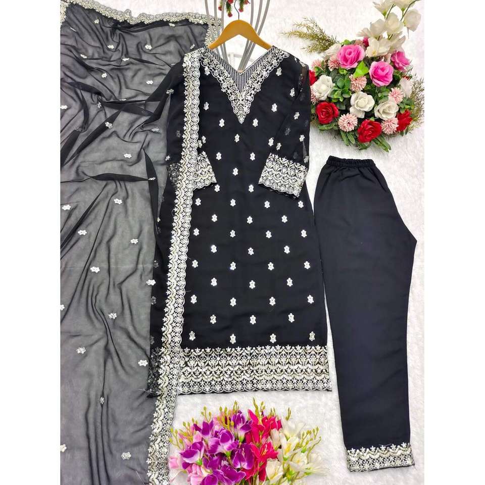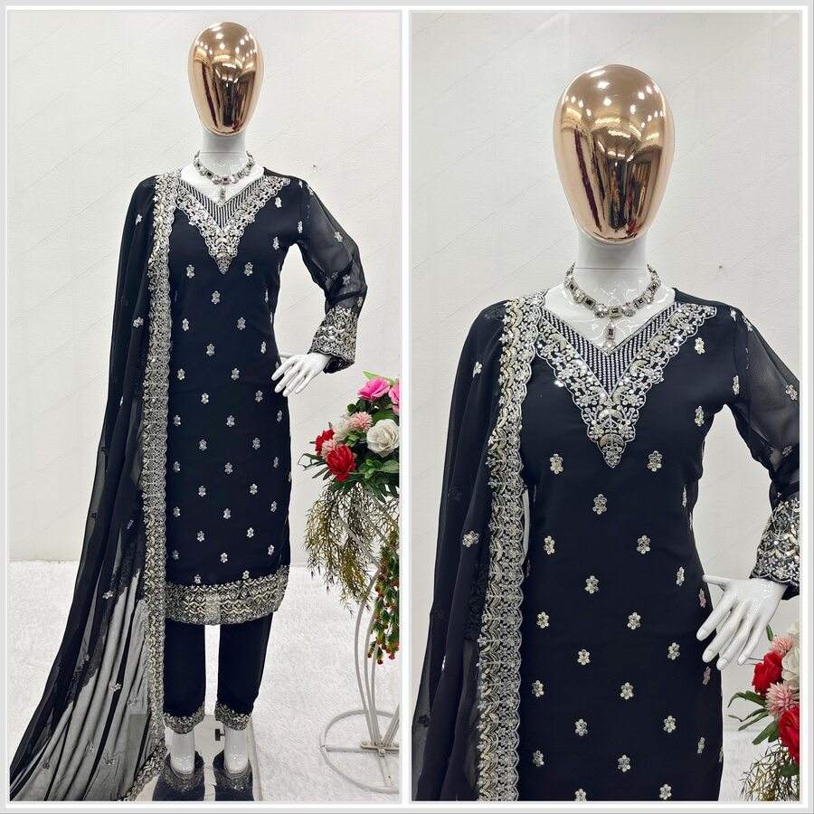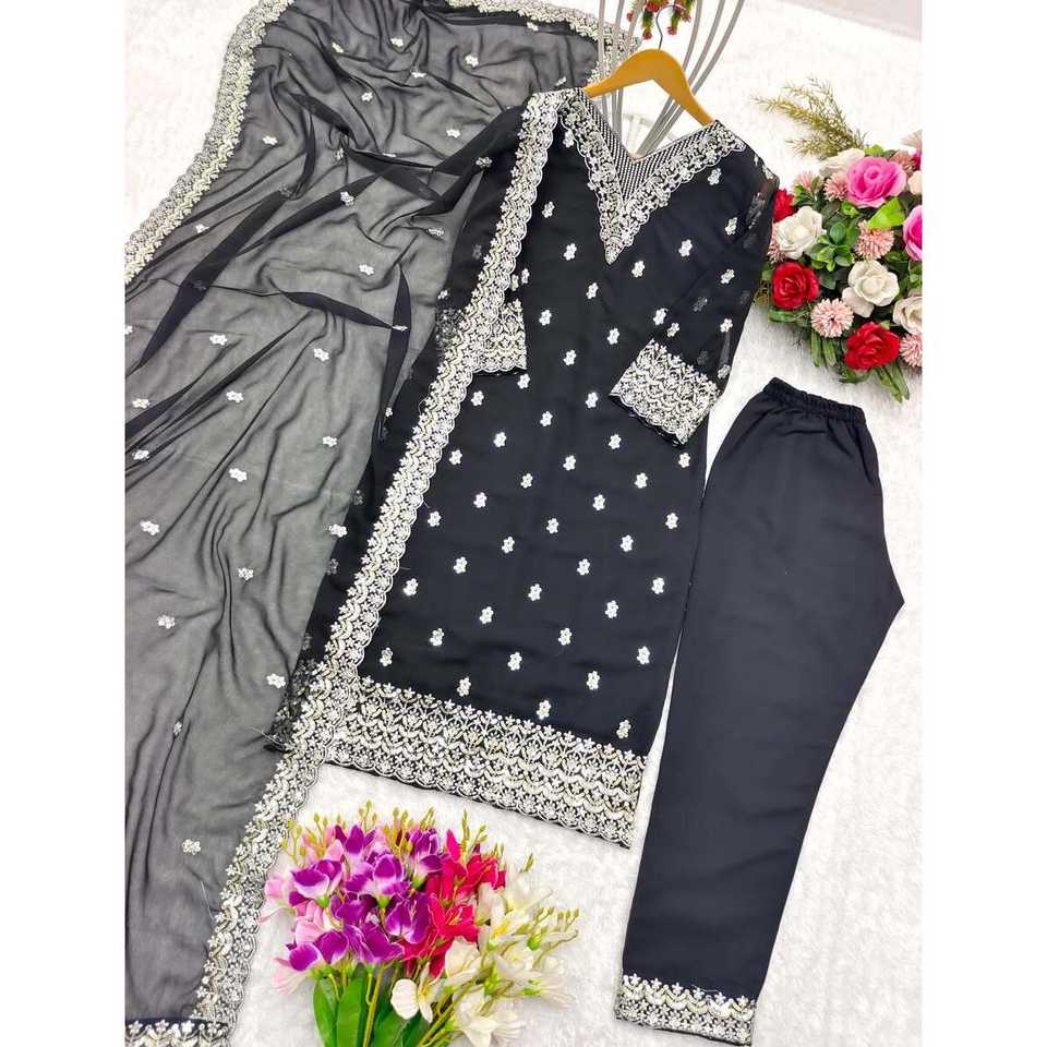 Designer Georgette Embroidery Sequence Lace Work Top Bottom and Dupatta in Black XXL Size