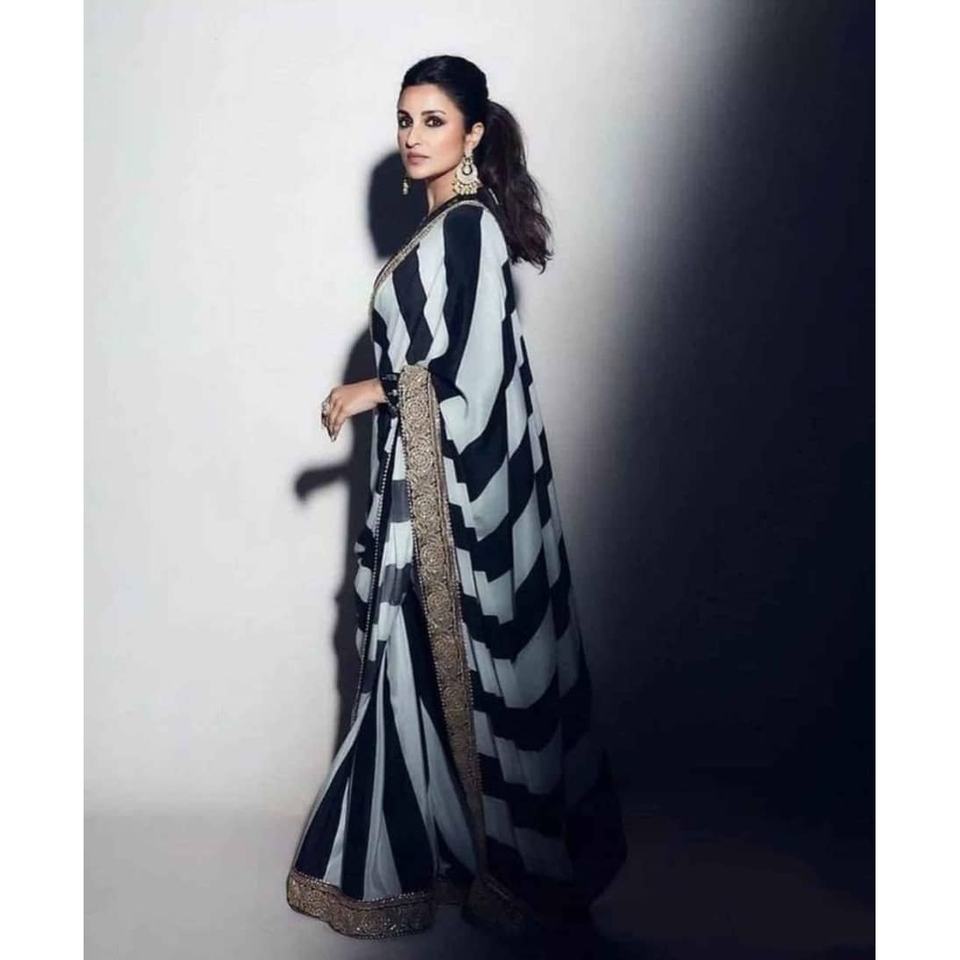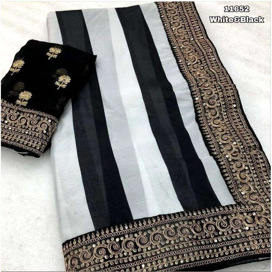 DESIGNER GEORGETTE WHITE and BLACK PRINT HEAVY LACE BORDER SAREE WITH USNTITCHED BLOUSE