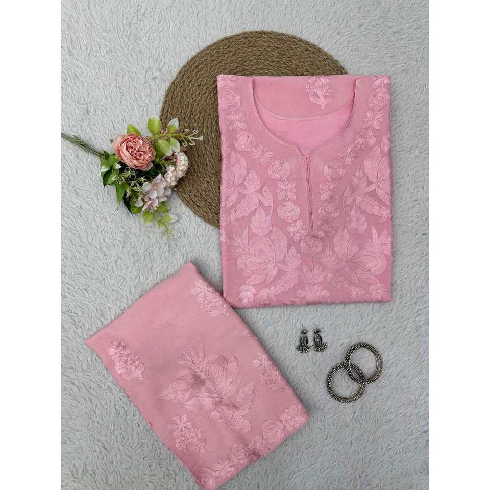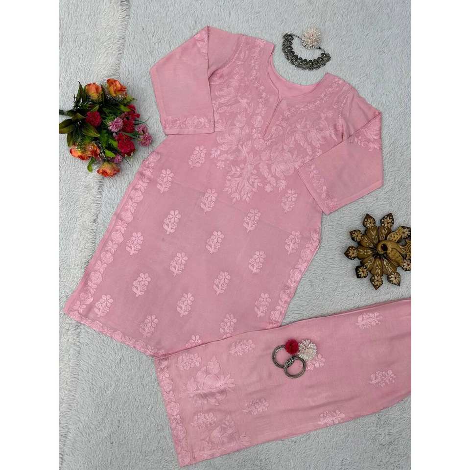DESIGNER HEAVY RAYON CHAIN STITCH WORK KURTI with PALAZZO BABY PINK