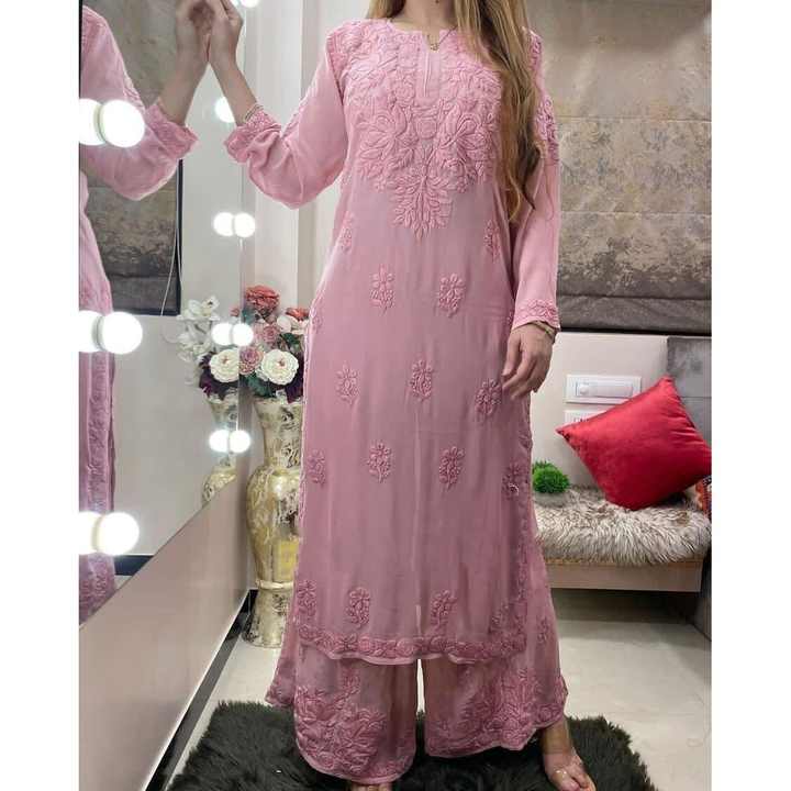 DESIGNER HEAVY RAYON CHAIN STITCH WORK KURTI WITH PALAZZO BABY PINK