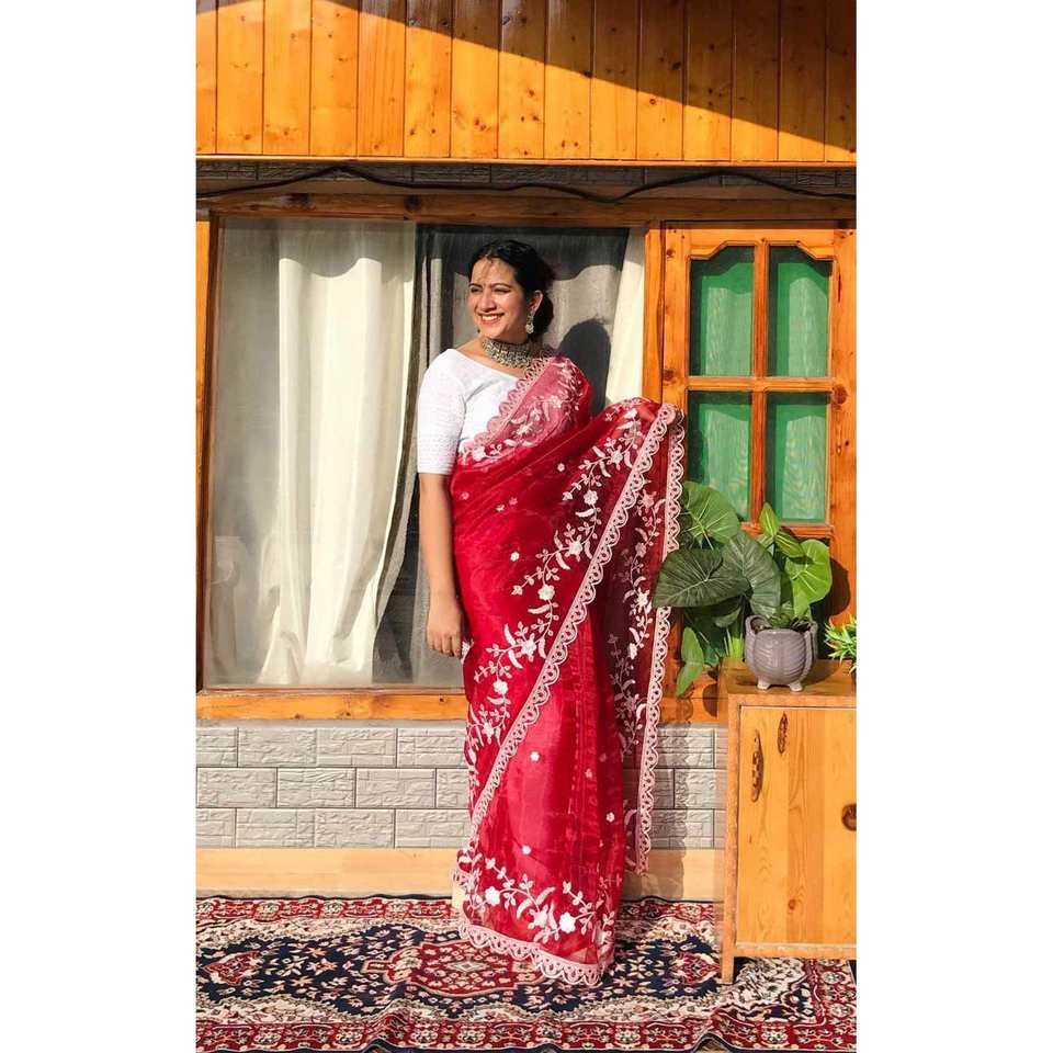 Designer Organza Embroidery Thread Saree with Unstitched Blouse Red