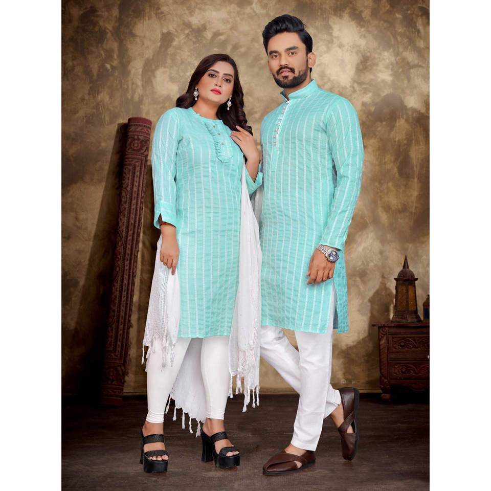 DESIGNER PREMIUM LINEN COTTON FABRIC WITH COLOURFUL WEAVING TOP and SHORT KURTA READY to WEAR SKY