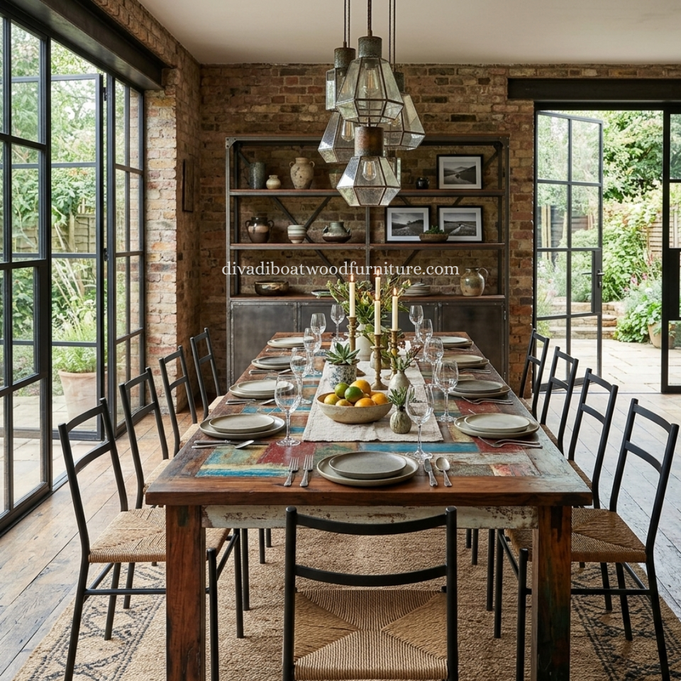 DIVADI Dining Table Java Style Patchwork Knockdown Reclaimed Boat Wood Sustainable Design Eco-Friendly For Indoor and Outdoor