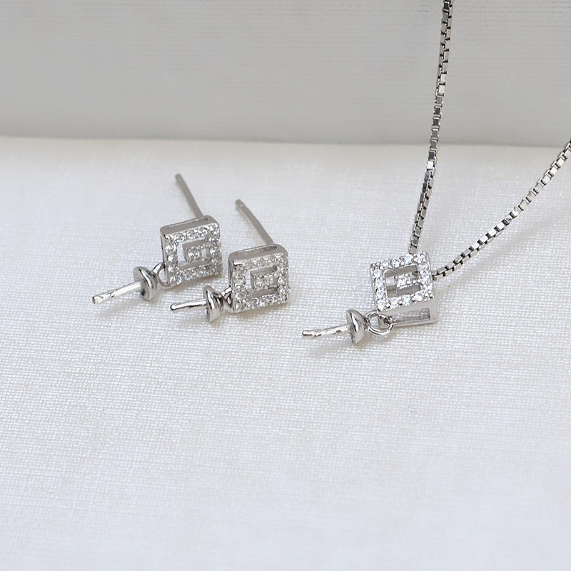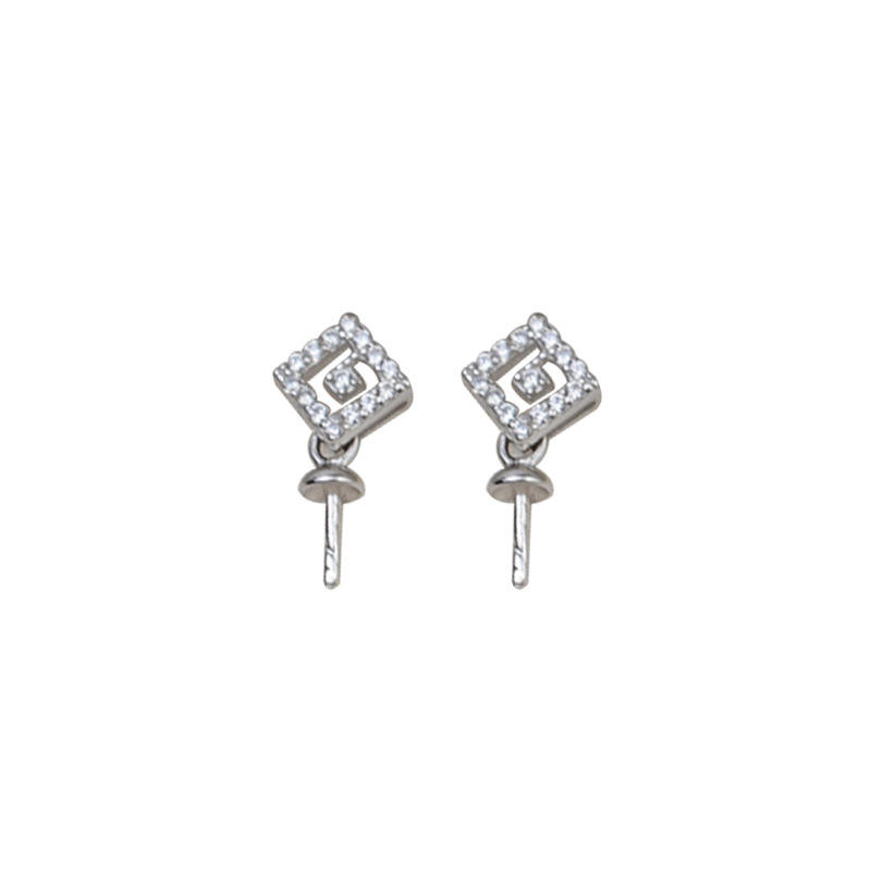 DIY Accessories S925 Silver Square Pendant Head with Small Earnail Empty Pearl Earrings Support Semi-Finished Jewelry-Bagged