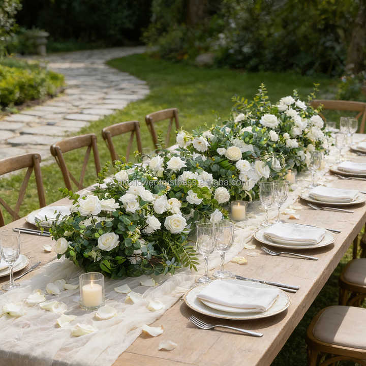 DKB New Design Modern Customized Artificial Artificial Silk White Rose Flower Row Table Runner Wedding Centerpieces