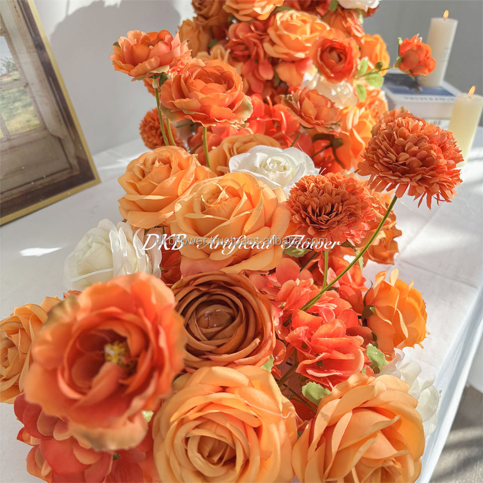 DKB Wholesale Artificial Orange Floral Table Runner Rose Hydrangea Flower Runner for Wedding Events Decoration