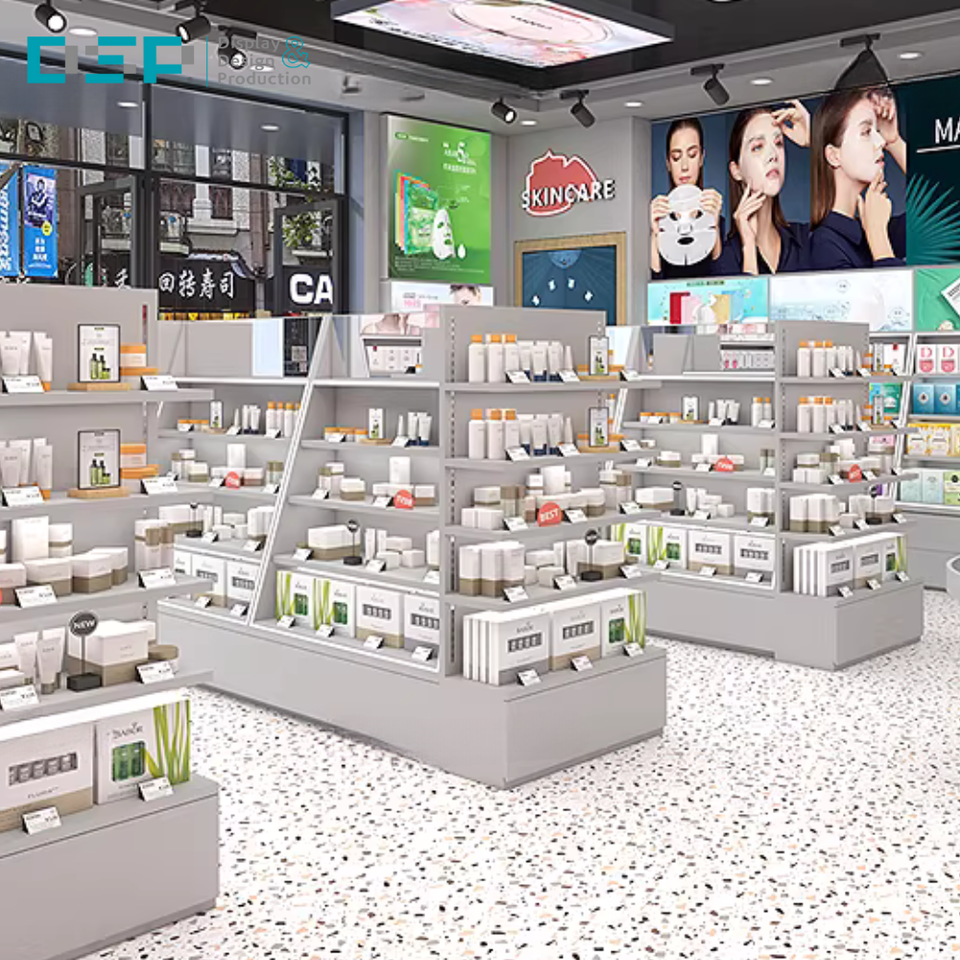 DSP Vietnam Factory Illuminated Modern High-gloss baked spray coating Skincare Display Stand Wooden Cosmetic Island Counter