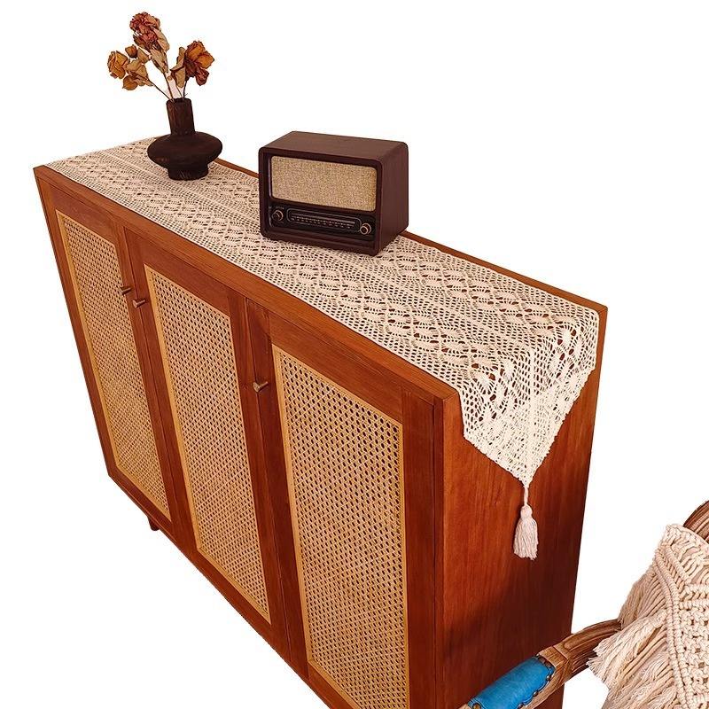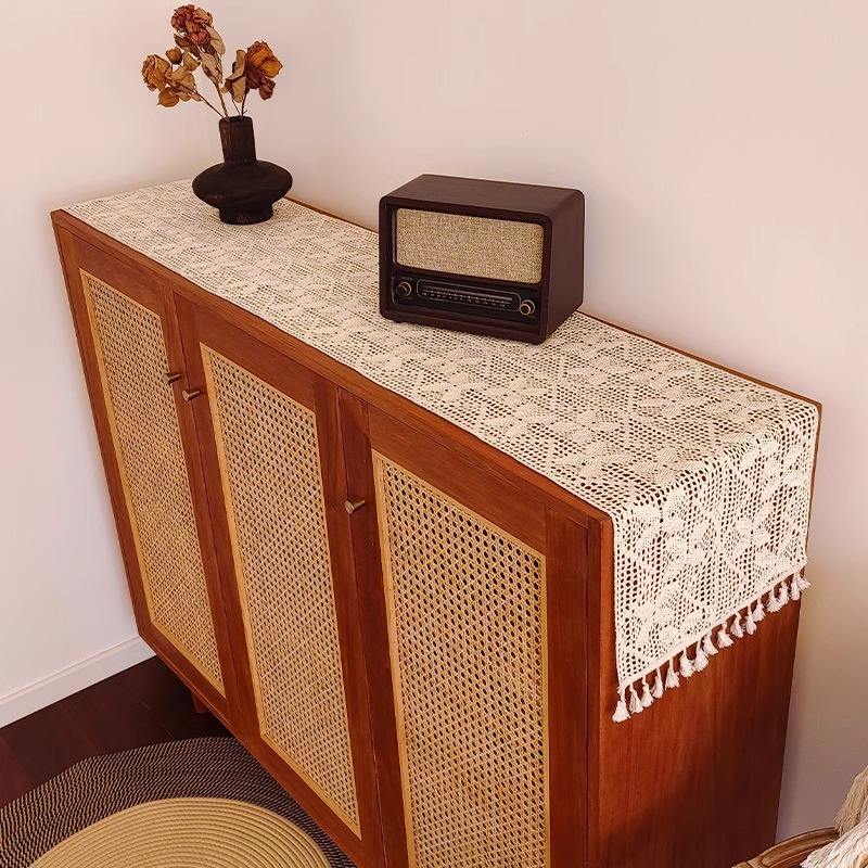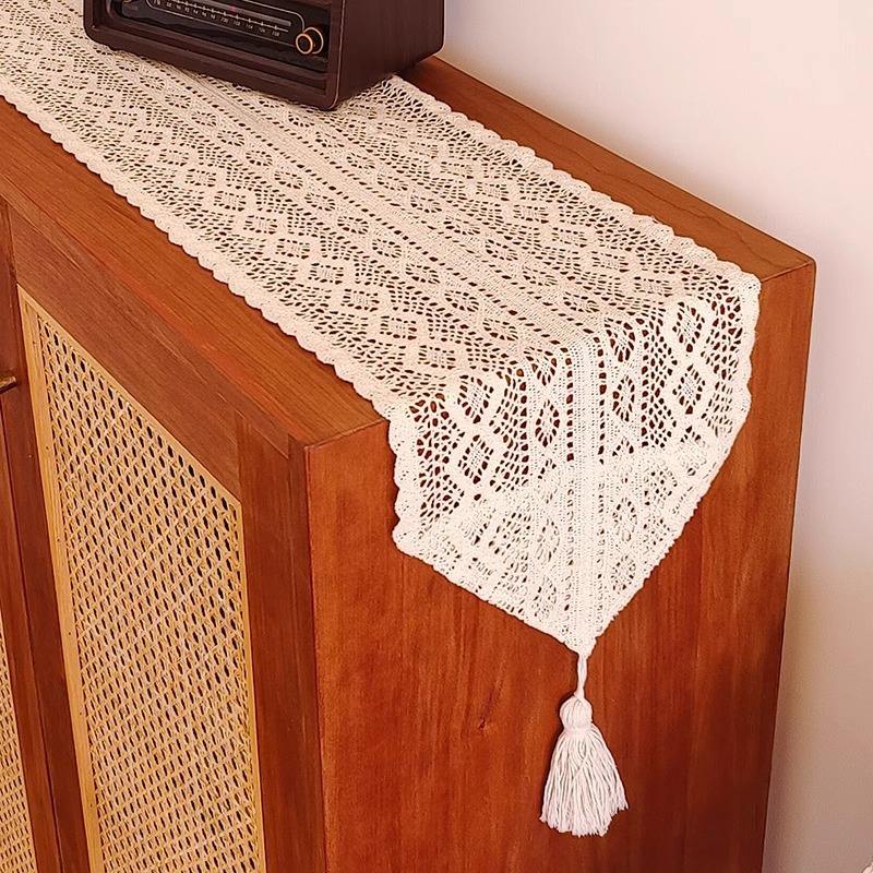 Da Retro Hollowed Out Table Runner Cotton White Vintage Style With Tassel For Living Room And Dining Decor