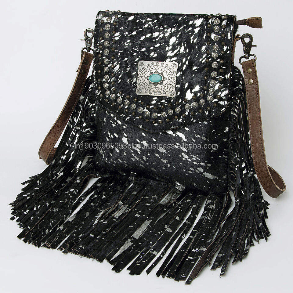 Western Bohemian Cowhide Hair-on- Leather Crossbody Bag with Fringe Tassel and Flower Decorations for Daily Use in Autumn