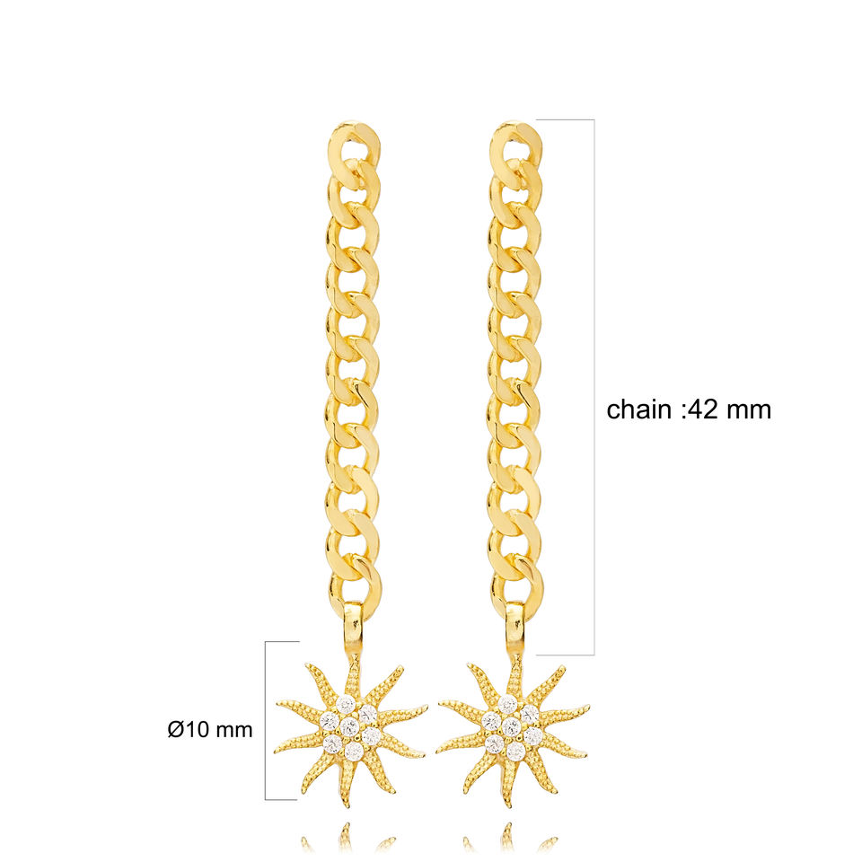 Dainty Chain Sun Design Zircon Stone Long Earring Wholesale Handmade Turkish 925 Silver Sterling Jewelry