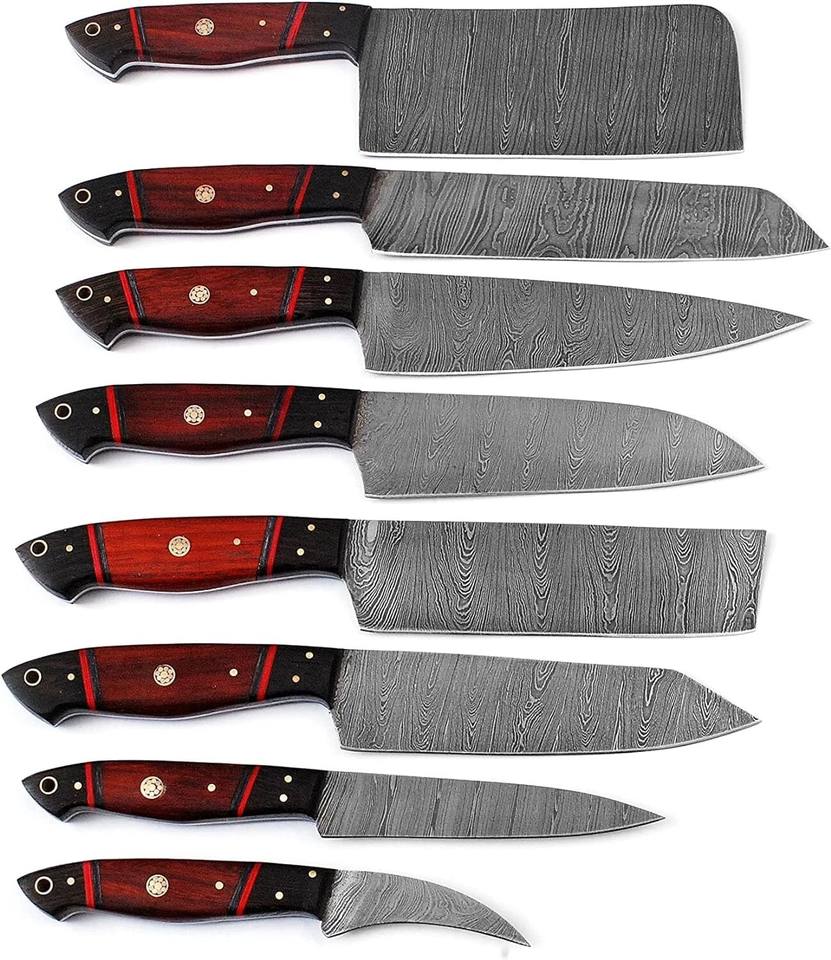 Damascus Steel Chef Knife Set with Red Wood Handle Eight-piece Custom Forged Handmade OEM Professional Kitchen Knives With Bag