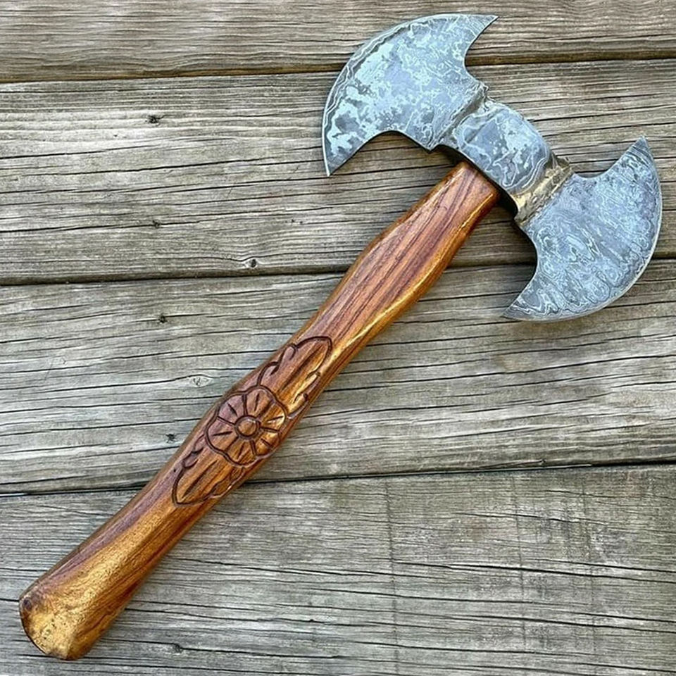 Damascus Steel Double Head Axe Heritage Style Outdoor Tool With Handmade Pattern Steel Head Damascus Steel Double Head Axe