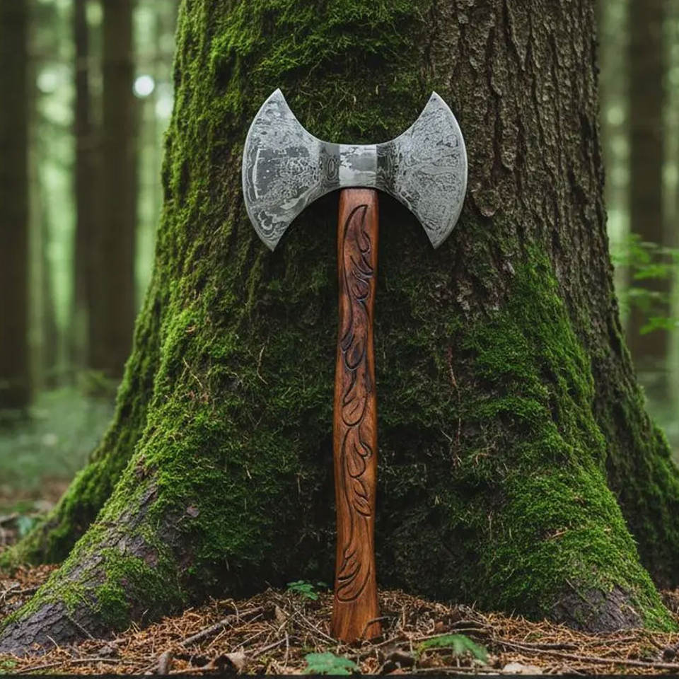 Damascus Steel Double Head Axe Luxury Artisan Crafted Tool With Balanced Design For Outdoor And Collector Use