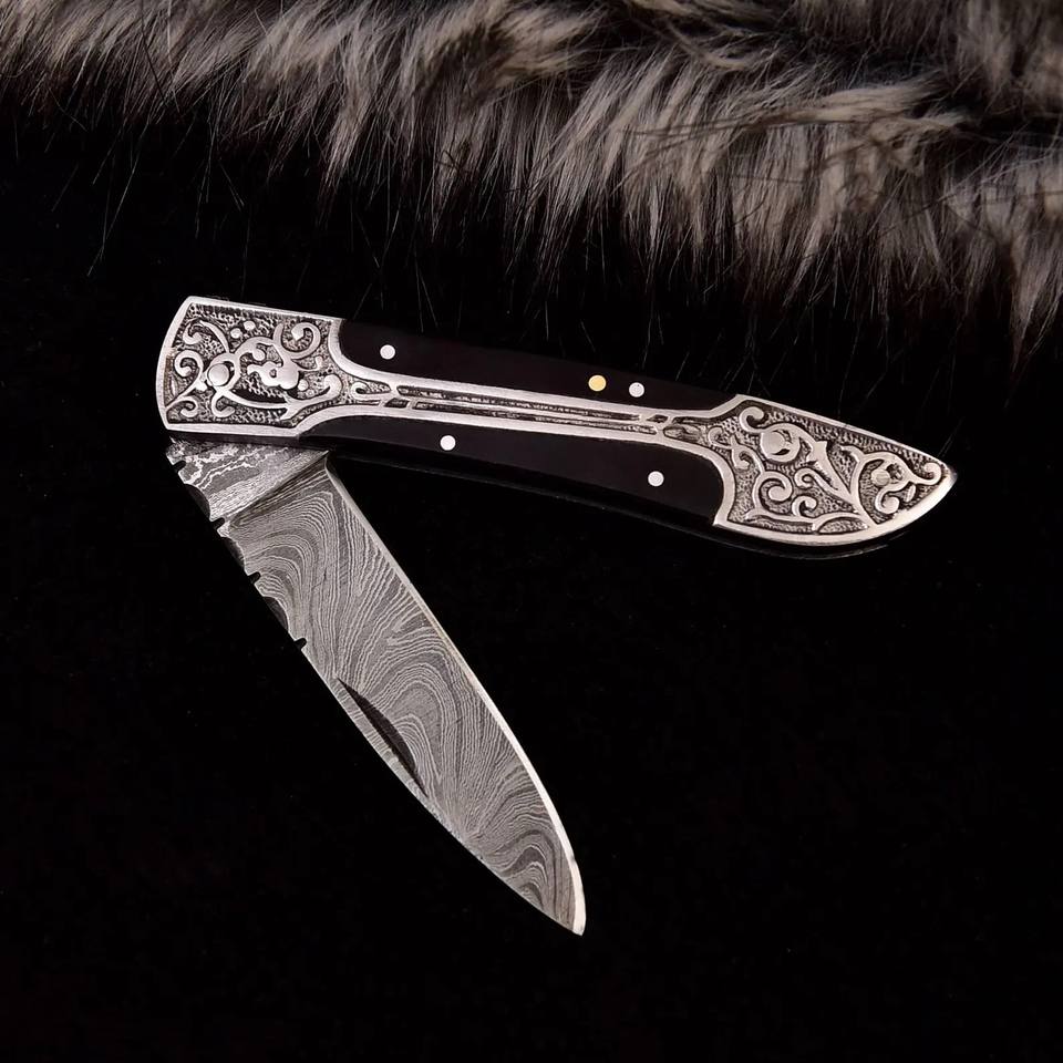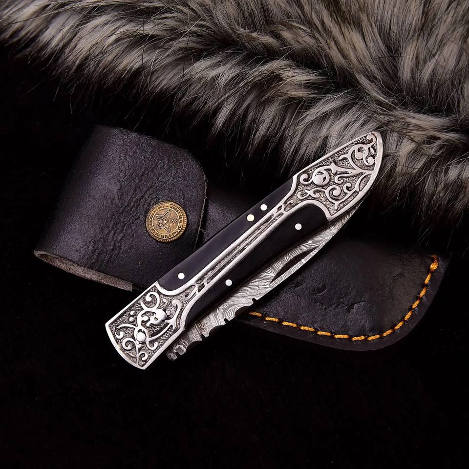 Damascus Steel Folding Knife Engraved Handle Vertical Carry Sheath Pocket EDC Hunting Camping Drop Point Knife Custom OEM Knife