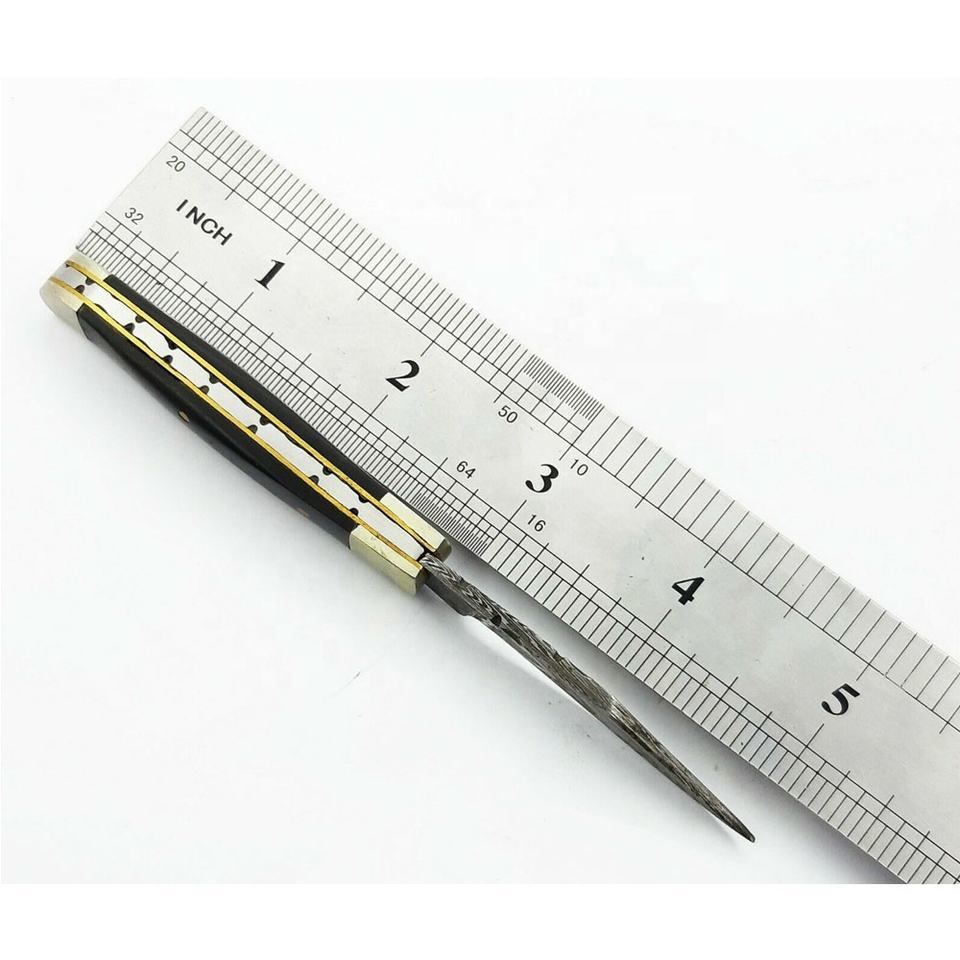 Custom Damascus Steel Folding Pocket Knife Horn Handle, Personalized Name & Logo, Top Quality for Hunting, Camping, Ideal Gift