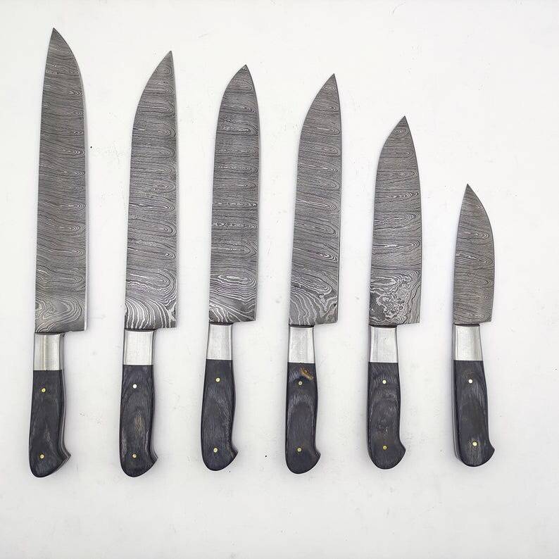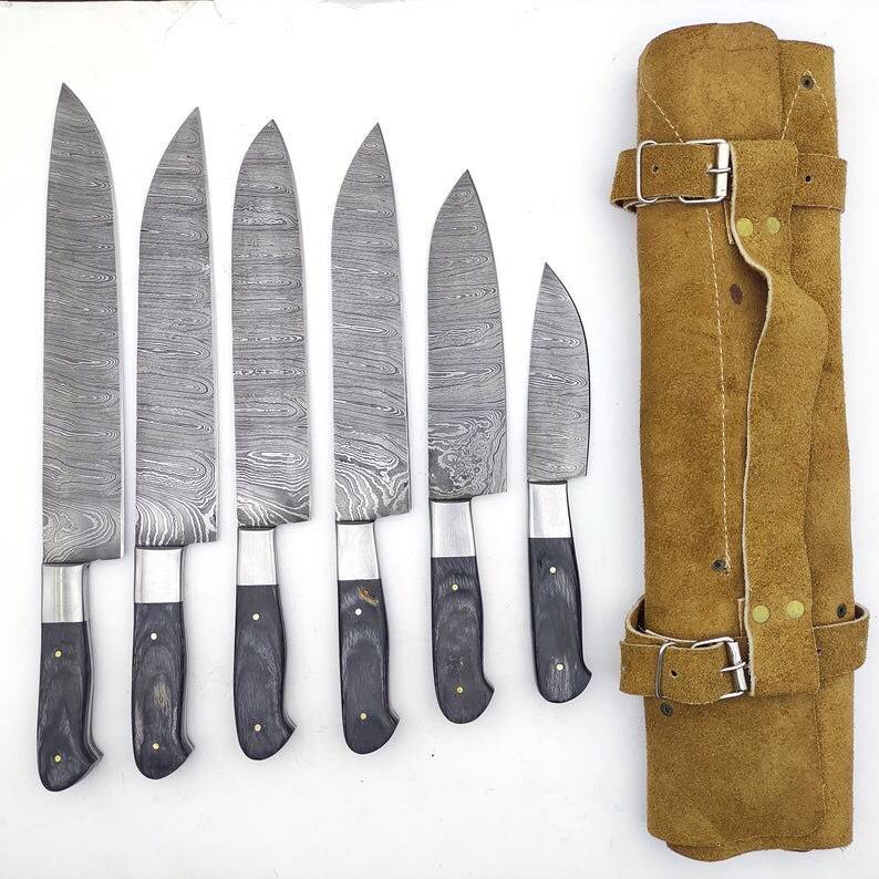 Damascus Steel Hand Forged 6-Piece Lightweight Professional Kitchen Chef Knife Set Ambidextrous Leather Sheath Pakka Wood