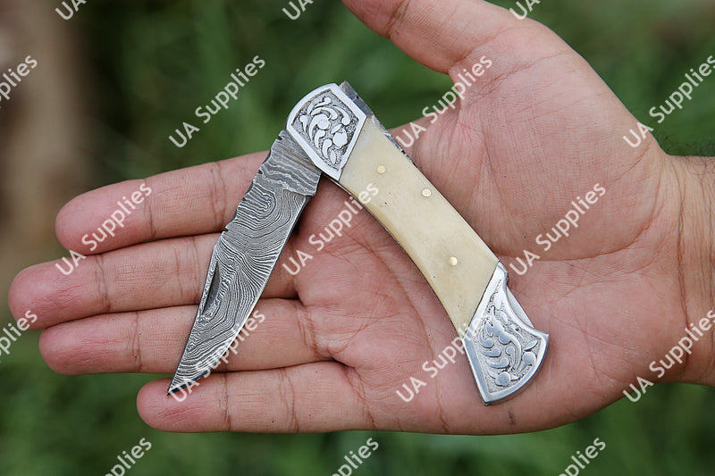 Damascus Steel Razor Sharp Industrial Grade Folding Knife Hand Engraved Camel Bone Handle Leather Sheath OEM/ODM Customizable