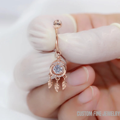 Dancing Diamond Navel Ring With Feather Dangle in Solid 18k Gold Body Jewelry Piercing Belly Button Ring Gift for Her
