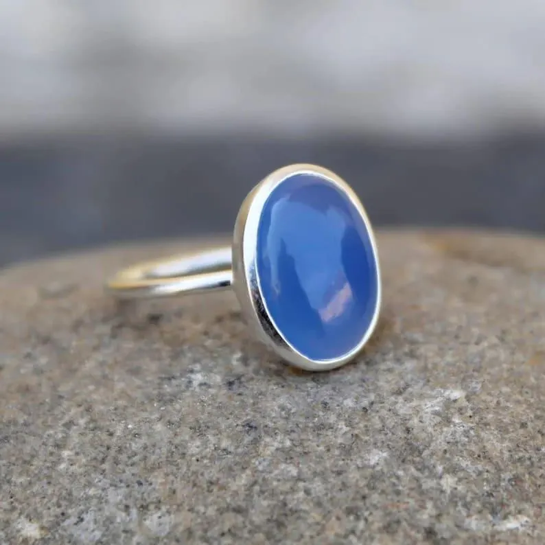Dark Blue Chalcedony Christian Bohemia Style 925 Sterling Silver Eco-friendly Unisex Gemstone Oval Faceted Chunky Ring