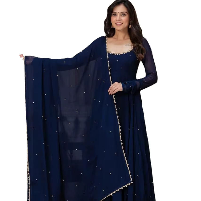 Dark Blue Color 4 Mtr Huge Flair Pattern Summer Comfort Hand work With LCD Stone work Fancy Kurti With Dupatta Set For Women