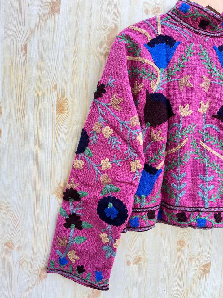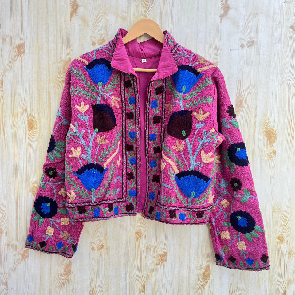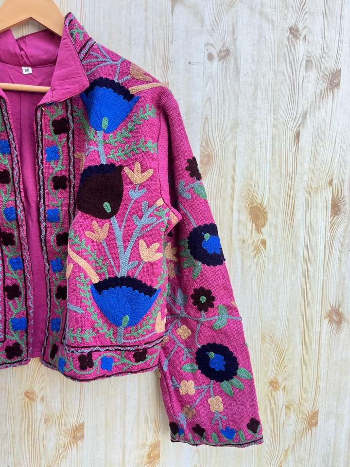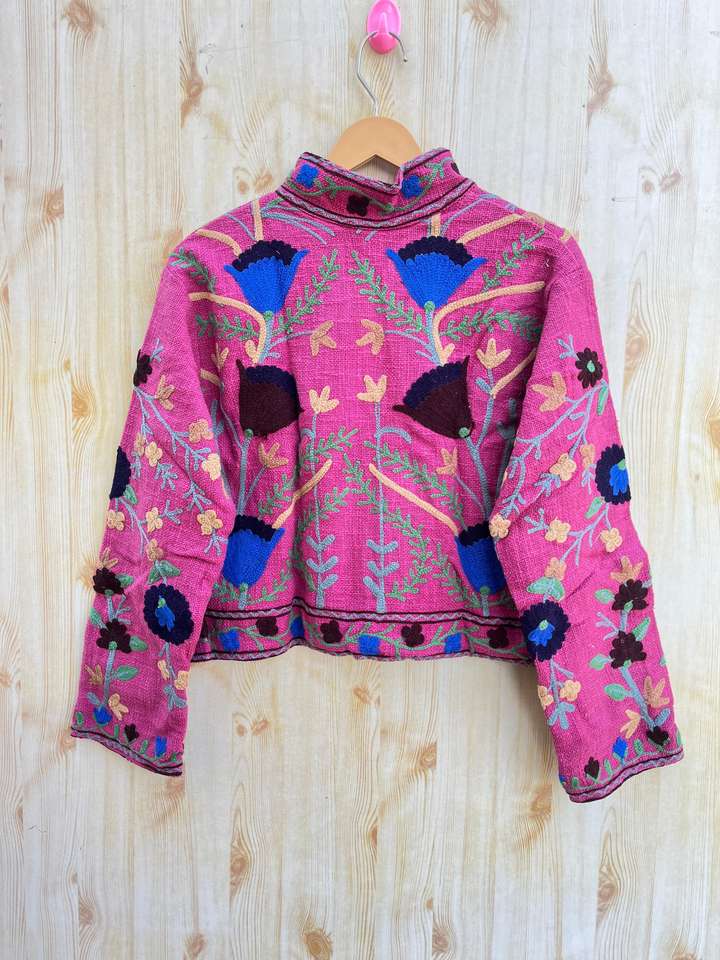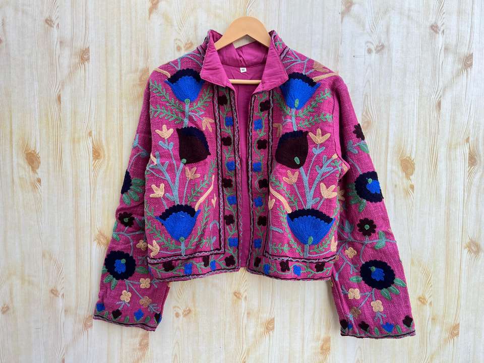 Handmade Dark Blue Vintage Short Jacket Breathable Cotton Sari Kantha Coat Embroidered Patchwork Knitted Printed Double Breasted