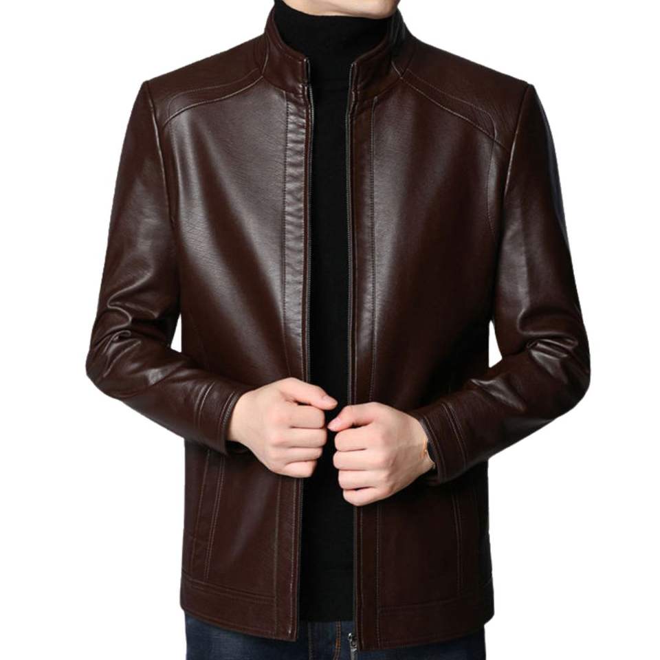 Dark Brown Casual Canvas Leather Jacket Slim Fit Crew Neck Full Zip Closure Waterproof Breathable Eco-Friendly Winter