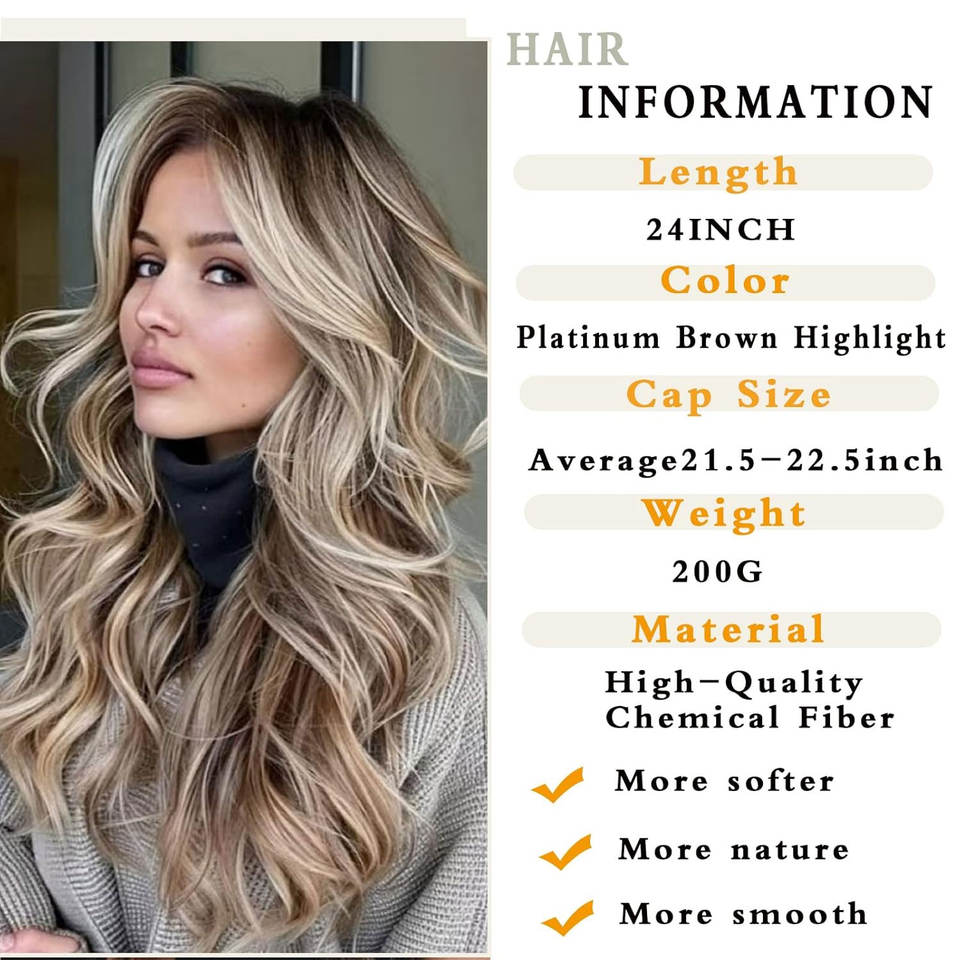Dark Brown Highlight Layered Wig for Women Long Wavy Curly Synthetic Hair with Curtain Bangs Natural Ombre Blonde Mixed White