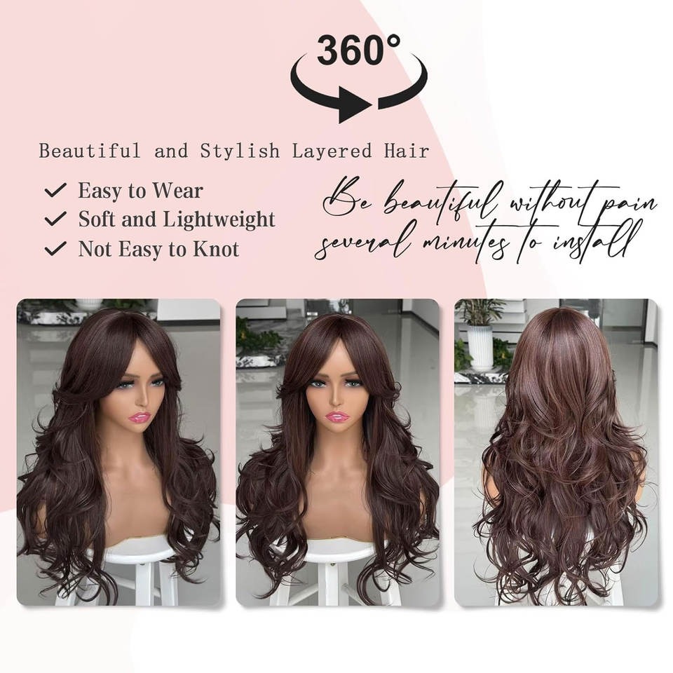 Dark Brown Highlight Wavy Wig with Curtain Bangs for Women Long Layered Synthetic Hair Natural Look DARK Brown