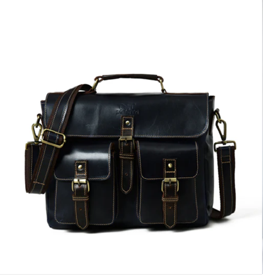 Dark Brown Leather Messenger Bag with Two Front Pockets and Adjustable Shoulder Strap, Available at wholesale prices.
