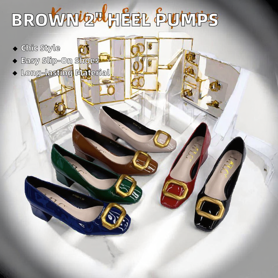 Dark Brown Women's Square Toe Mid Heel Pumps High Quality 2-Inch Gold Buckle Slip-On Breathable Rubber Shoes Spring Summer