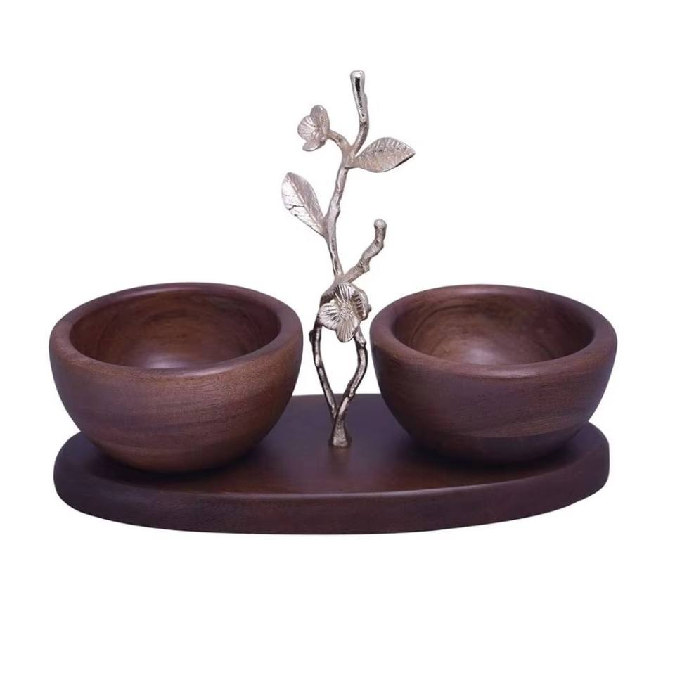Dark Brown Wooden Decorative Bowl With Leaf Designing Aluminum Silver Ware Table Top Home and Cafe Mixing Bowls at Lowest Price