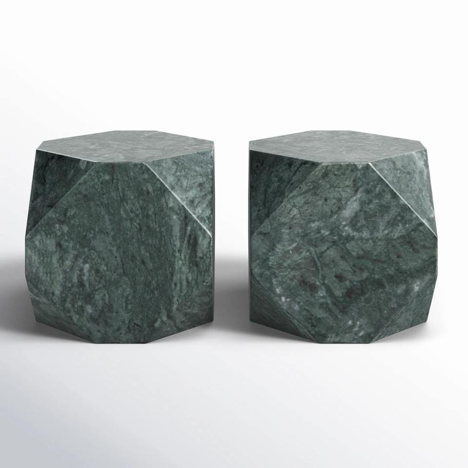 Dark Green Aluminum Faceted Modern Geometric Polyhedron Shape Bookends Pair Heavy Weighted Polished Stone Book Supports