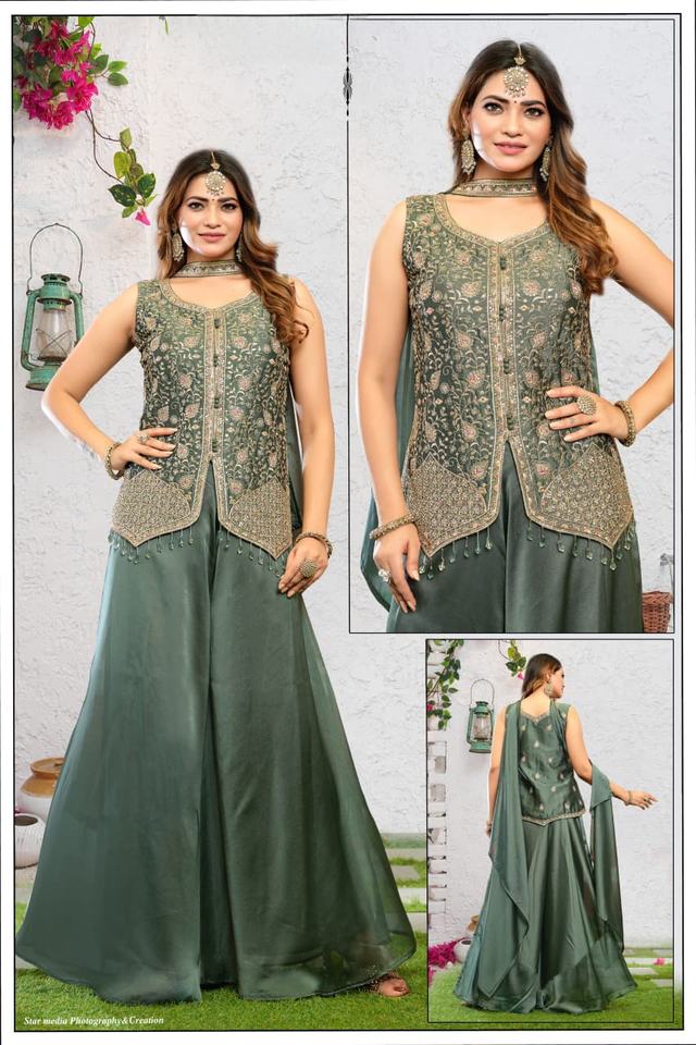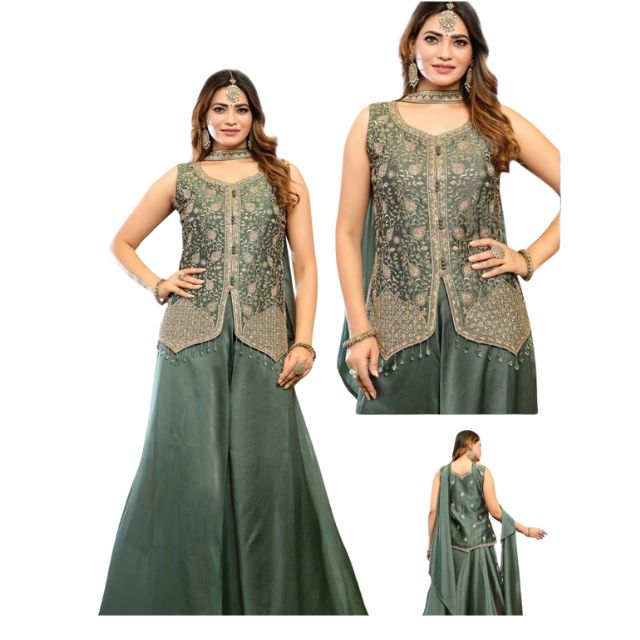 Dark Green Embroidered Sharara Suit Set for Women with Designer Kurti Dupatta for Wedding Festive Wear