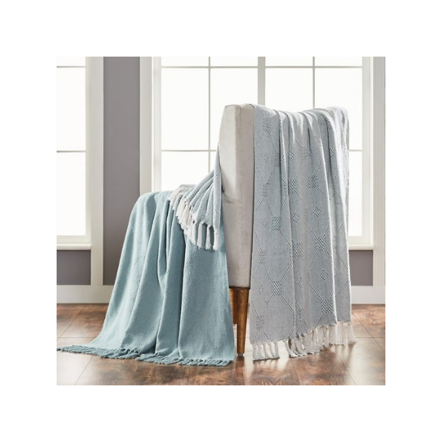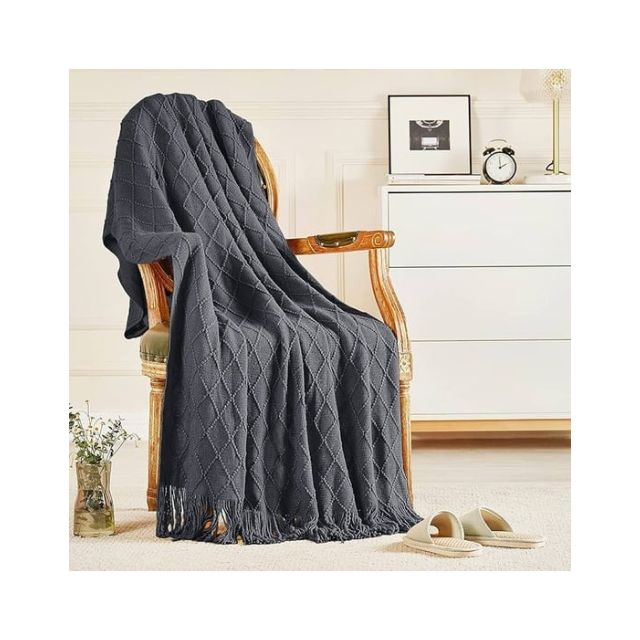 Dark Grey Textured Soft Recycled Acrylic 70x90in Jacquard Pattern Sofa Throw With Fringes GRS Certified Stylish Eco Decor Option