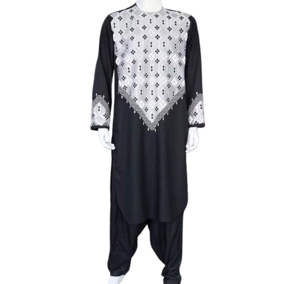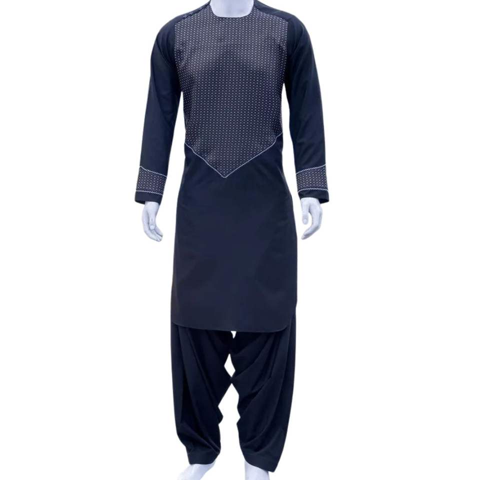Dark Indigo Men Afghani Dress V Shape Embroidered Perahan Tunban Traditional Islamic Gents Wear Pashtun Stitched Suit