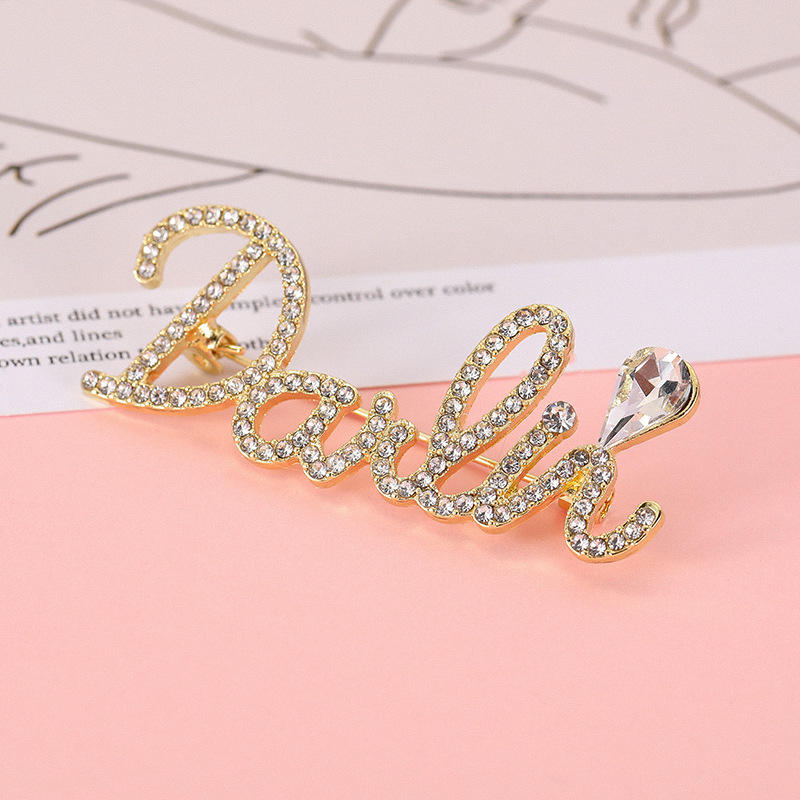 Darling Goodluck Letter Inlaid Rhinestone Brooches for Women Simple Elegant Charm Casual Alloy Brooch Pins Dress