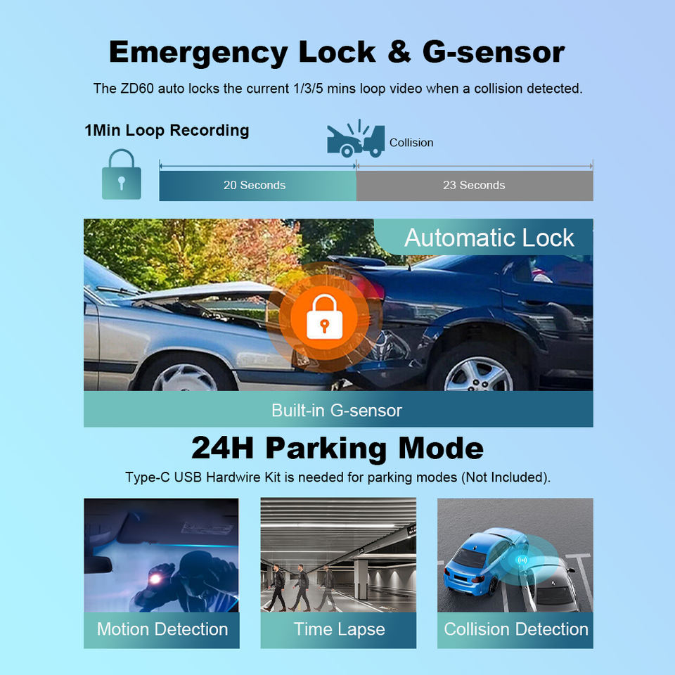 Night Vision, Full Color, G-Sensor, park MODE, Loop recording, Build-in WiFi, Motion Detection, App Control, Emergency Accident Lock, Build-in Battery, Remote ControlFunction