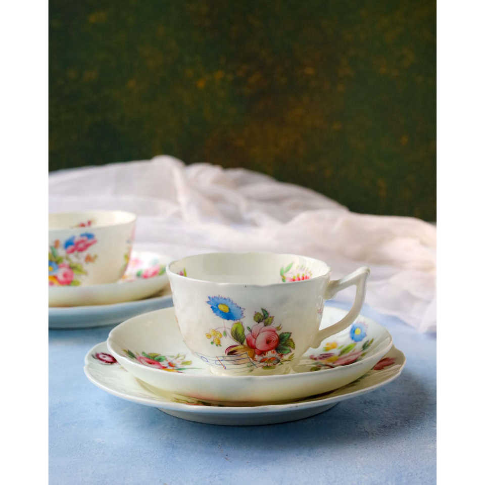 Davenport Pair of Hand-Painted English Porcelain Cups with Saucers and Rose Plate Fine 800 White and Rose-Colored
