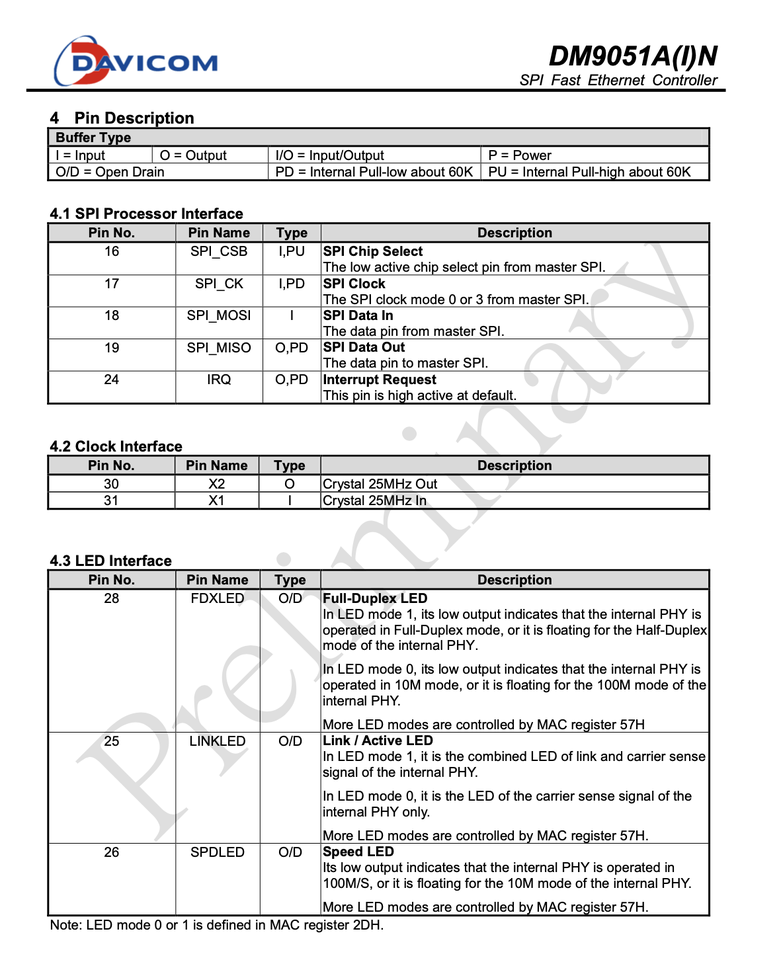 Description:The DM9051(I) is a fully integrated and cost-effective low pin count single chip Fast Ethernet controller with a Serial Peripheral Interface (SPI), a 10/100M PHY and MAC, and 16K-byte SRAM. It is designed with low power and high performance process interface that support 3.3V with 5V IO tolerance. The PHY of the DM9051(I) can interface to the UTP3, 4, 5 in 10Base-T and UTP5 in 100Base-TX with HP Auto-MDIX.It is fully compliant with the IEEE 802.3u Spec. Its Auto-Negotiation function will automatically configure the DM9051(I) to take the maximum advantage of its 10M or 100M abilities. The DM9051(I) supports IEEE 802.3az in PHY and MAC to save power consumption when Ethernet is idle. The IEEE 802.3x Full-Duplex flow control and Half-Duplex back-pressure function also supported to avoid Ethernet packet loss with link partner. The slave SPI interface is designed to support SPI clock mode 0 and 3 that compatible with the all master SPI interface of CPU. The clock speed can up to 50Mhz to co-operation with most high throughput master SPI. The SPI burst command format is code-effective to minimize the command overhead in access DM9051(I) internal registers and packet data in memory.