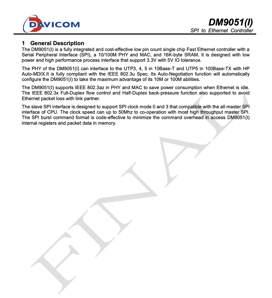 Slave SPI Interface with clock speeds up to 50MHz for high throughput applications , Support SPI clock mode 0 and 3 , Support 10BASE T and 100BASE TX and 100M Fiber interface , Support HP Auto MDIX crossover function in 10BASE T and 100BASE TX , Support IEEE 802.3az Energy Efficient Ethernet (EEE) , Support interface for EEPROM to configure chip settings , Support back pressure flow control for Half Duplex mode , Support IEEE802.3x flow control for Full Duplex mode , Supports wakeup frame, link status change and magic packet events to generate remote wake on LAN (WOL) signal , Support IPv4/ TCP / UDP checksum generation and checking , Configurable of internal transmit/receive buffers within 16K byte memory , Built in integrated 3.3V to 1.8V low noise regulator for core and analog blocks , Support EMI (Class B) and HBM ESD Rating 8KV , Support Industrial Temperature Range: - 40℃ to +85℃ (DM9051I) , 3.3V I/O with 5V tolerant, DSP architecture PHY Transceiver, 0.18um process