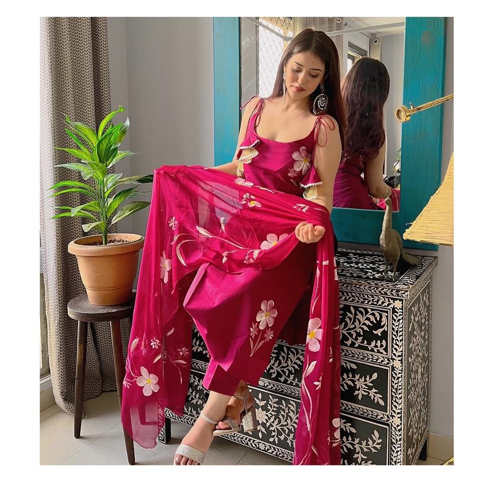 Dazzling And Charismatic French Crepe Fabric Kurti Pant For Women with Dupatta Partywear Suits Available In India World