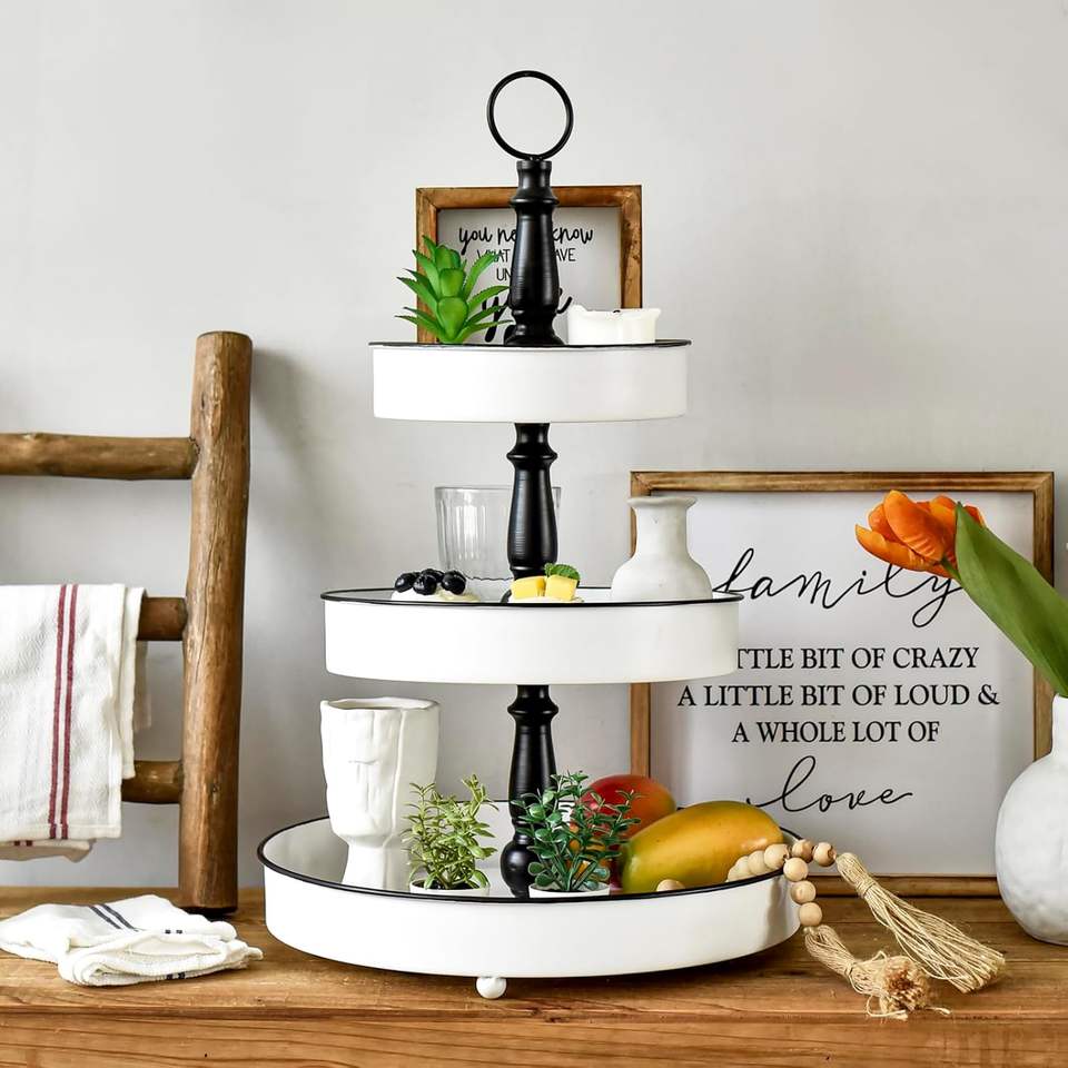Decorative 3 Tiered Metal Tray Stand with Handle for Kitchen Dining Room Bathroom Shelf Coffee Bar Table Black and White